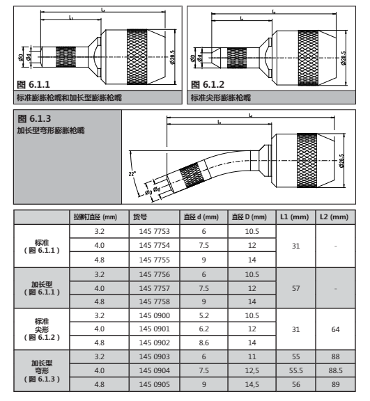• 加长型膨胀枪嘴以及加长型弯形膨胀枪嘴的顶端形状与标准膨胀枪嘴相同,适用于不易进